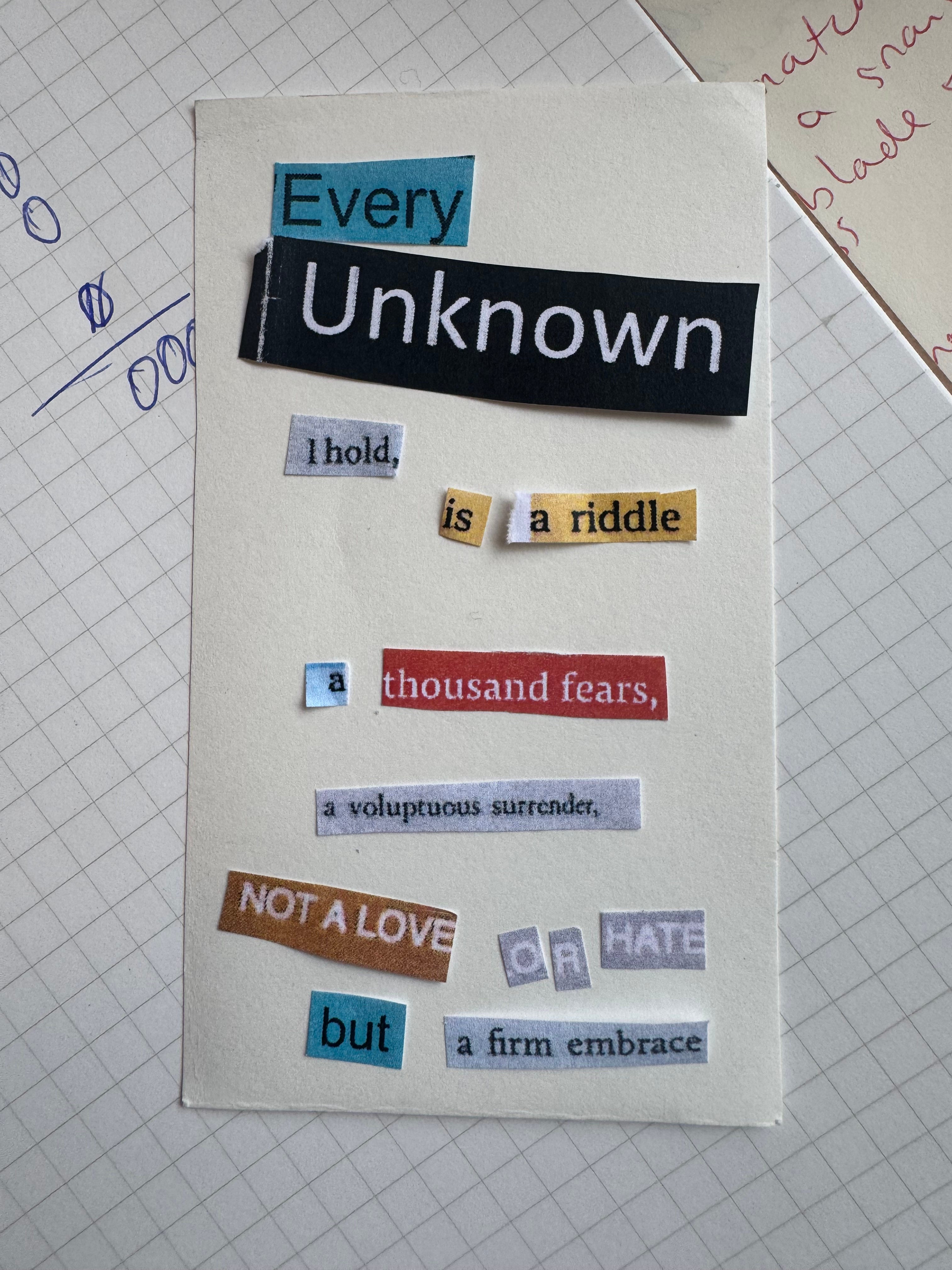 During my week away, I responded with playfulness and earnestness alike to various levels of confrontation in the prompts, which should’ve been expected from a retreat called “unknown feels”, and yet consistently took me by surprise.